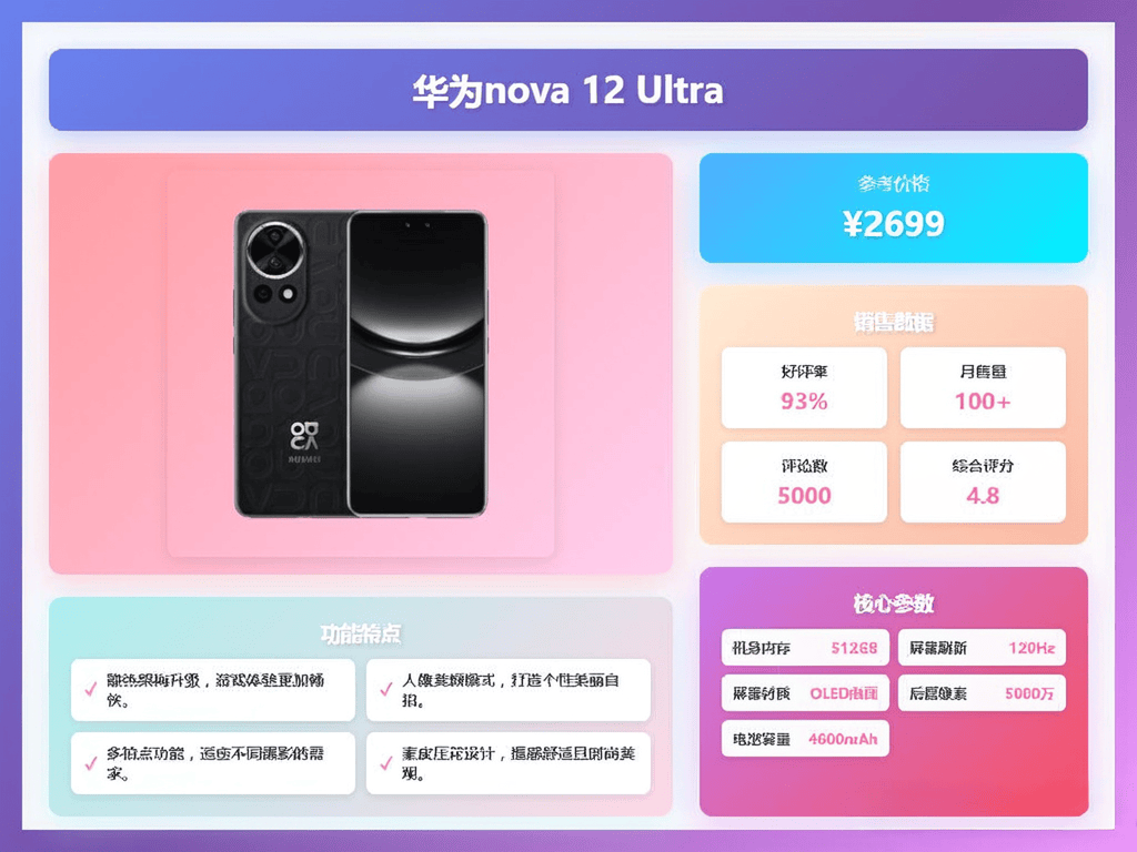1️⃣大屏臻彩体验:华为nova 12 Ultra配备6.76英寸的动态臻彩屏,支持1-120Hz的自适应刷新率,2160Hz高频PWM调光让观看体验更加顺滑。